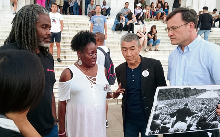 キング牧師の演説場所に立つバクレー監督と松元ヒロさん(右から2人目)