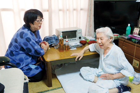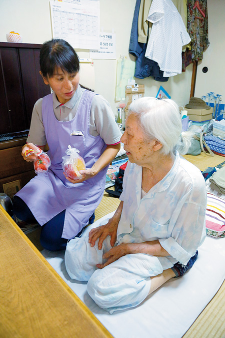 東京都足立区の古びた公団住宅の5階。訪問介護事業所「ファミリーケア柳原」のヘルパー市川那津子さんがドアを開け、「こんにちわぁ、栄子さん(仮名)」と呼び掛ける。奥の和室の布団の上にちょこんと座っていた栄子さん(81歳)が振り返り、人懐こい笑顔を見せた。
