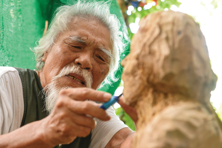 アトリエの軒先には数々の作品が並ぶ。新たに加わった少女像と老婆の像の隣に、斜め上を向き、突き出したあごにひげを蓄えた「土人」の像が置かれている。