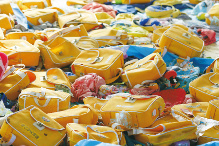 保育室には、たくさんの通園バッグが無造作に積まれていた。「持ち主に返そうと思った時もあったんですけど」と柗本さん。原発事故の直後に避難指示。その後は帰還困難区域に指定された双葉町では、放射能汚染を恐れ町内から“物”を持ち出すことができなかった。現在では「特定廃棄物」扱いだ。