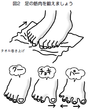 外反母趾を指摘された人は、さらに足の筋肉を鍛えるために、足ゆびを反らせる運動、足ゆびを屈伸してのタオル巻き上げ運動や足ゆびジャンケン運動(図2) も追加してやるのがよいでしょう。この運動は結構むずかしく、意外とうまくできません。変形がない方も試してみてはいかがでしょう。