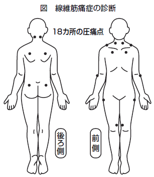 明確な診断基準はなく、現段階では1990年アメリカリウマチ学会の分類基準(図)を参考にしています。全身に18カ所ある圧痛点を4kgの力で押して11カ所以上の痛みがあり、また広範囲の痛みが3カ月以上続いている場合、線維筋痛症と判断します。
