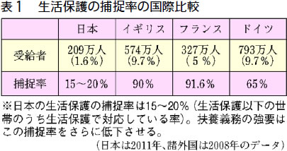 また、必要な人が生活保護を利用できているかという点では、受給率、捕捉率とも先進諸国の中で異常なほど低レベルです(表1)。捕捉率とは生活保護を受けるべき状態にある人のうち、受給できている人の割合を示す数字で、日本は一五~二〇%しかありません。