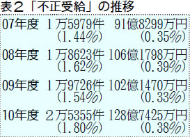 shinbun_1526_05  「不正」と数えられた中には、部活費用を捻出するために高校生が行ったバイト代を、必要と知らされず申告しなかった場合などが多いのです。申告していれば 収入認定から外され得る性格のもので、悪質とはいえません。件数や金額の増加は受給世帯全体の増加に伴う現象で、発生率(表2)をみればそれほど増えていません。