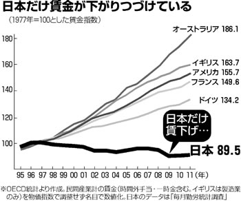 一方、民間企業の労働者の平均賃金は一九九七年に四六七万円だったのが、二〇一〇年には四一二万円と五〇万円以上も減らされました。また二〇〇二年には 七〇歳以上の高齢者の医療費窓口負担が定額から一割負担に、健康保険本人の負担が二〇〇三年には二割から三割に、さらに介護保険料の自己負担増や制度改 悪、生活保護老齢加算廃止など次々と社会保障制度が改悪されました。