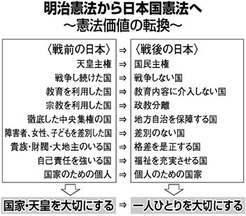 しかし、多くの尊い人びとの犠牲の上に立って、不戦平和を誓い平和憲法を制定しました。戦後六八年間、日本は一度も戦争をしたことはありません。あのイラ ク戦争への自衛隊の派遣ですら「非戦闘地域での救援活動」と言わざるを得ませんでした。この違いは、憲法九条の存在そのものであり、明治憲法のもとでは、 国民の権利(権理)、人権は全く認められていませんでした。戦後、私たちは平和憲法をよりどころに社会保障や人権の拡充をすすめてきました。憲法は国の暴 走を防ぐために、国民が国家権力を規制する立憲主義に立っていますが、自民党改憲草案では天皇を「元首」とし、基本的人権を定めた九七条の全面削除、国防 軍を設置し軍の命令に従わないものは「死刑もある」(石破幹事長発言)という国が国民を縛るもので、明治憲法への逆戻りの道です。