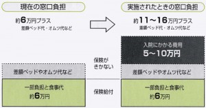 保険給付からはずされる額はまだ発表されていませんが、一カ月につき五万~一〇万円が保険外負担になるといわれています。