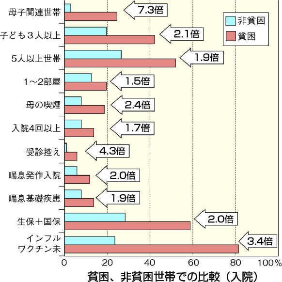 入院調査は、佛教大学教授でもある武内一医師(大阪・耳原総合病院)が報告しました。小児医療を扱う一一事業所が協力し、二〇一四年度の一年間の六七五件を検討しました。貧困群に多かった特徴は、繰り返し入院、夜間入院、受診控え・支払い困難、喘息発作での入院、基礎疾患に喘息がある、でした(図)。