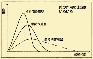たとえば寝つきの悪い入眠障害には、短時間型の薬剤(ハルシオンなど)が使用され、熟眠障害には中間型(ベンザリン、ネルボン、ユーロジンなど)ないし長 時下型(ソメリン)などが使用されます。医師は、それぞれの人に合わせて処方しますので、薬を他人にあげたりもらったりはしないでください。