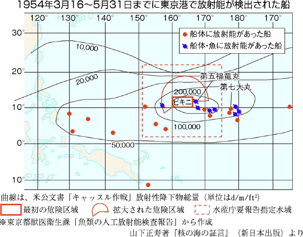 太平洋での核実験…マーシャル諸島でアメリカが行った核実験は、日本への原爆投下から7カ月目に始まり、58年の終了まで67回。太平洋沿岸の広域が汚染 された。54年3~5月、ビキニ環礁などで6回の実験がされ、3月1日の水爆「ブラボー」の実験で、操業中の静岡県の第五福竜丸の乗組員23人が「死の灰」を浴びた。急性症状が出、半年後に久保山愛吉さんが死亡(40歳)。汚染マグロは廃棄されたが、54年末に政府はマグロの放射能検査を中止。翌55 年、漁業の損害などへ200万ドル(当時7億2000万円)をアメリカが支払うことで幕引きされた。