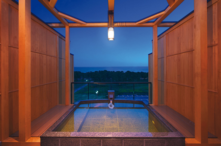 太平洋を眺めながら"黄金の湯"につかれる白子温泉(白子町温泉ホテル協同組合提供)