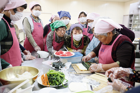 この日作ったのは、バラとサザンカの太巻き寿司。約30人の女性が手際よく下ごしらえをした後、講師の御園悦子さんが巻き方を披露しました。淡いピンクに着色したご飯と寿司飯、紅生姜、薄焼き卵と厚焼き卵、野沢菜、細切り人参、海苔がテーブルにずらり。