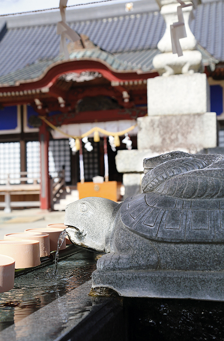 境内に入ると、手水舎に蛇と亀の石像が。拝殿の右脇にも置物があり、蛇の頭をなでながら祈願できるようになっています。白蛇はもともと縁起が良く、神の使いともいわれている稀少動物。ここでは縁結びの神様としても崇められています。