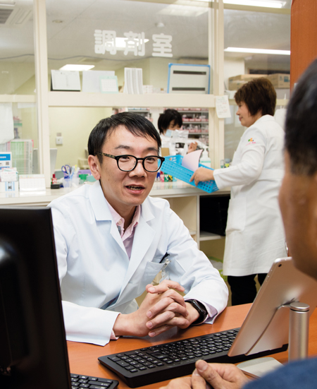 窓口で患者の相談にのる坂井直之さん。ふれあい豊田薬局で