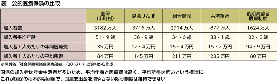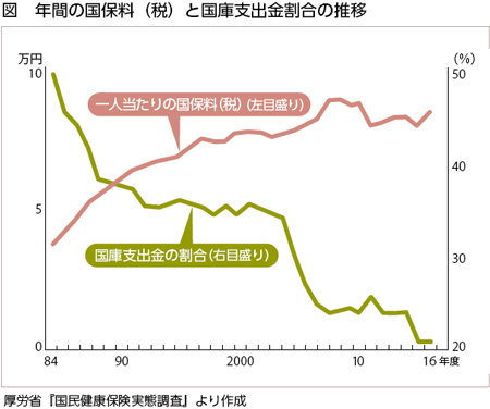 国保は「国民皆保険」の根幹をなす制度だが、構造的な問題を抱える。かつては農林水産業や自営業が加入者の7割だったが、現在は無職(年金生活者など)と非正規労働者が8割を占めるように。国が制度の安定運営のために投入してきた「国庫支出金」の割合は年々下がり(図)、他の協会けんぽ(中小企業)や組合健保(大企業)の加入者に比べて、「収入が低いのに保険料が高い」という極めて矛盾した制度になっている(次ページ表)。