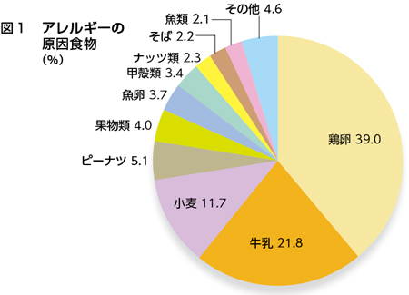 図1のように鶏卵、牛乳、小麦で食物アレルギーの原因の7割を占めますが、そのほかピーナツ、果物類、魚卵などさまざまな食べ物で症状が起きる可能性があります。日本では幼児の10人に1人が食物アレルギーを持っていると言われますが、子どもは成長とともに免疫機能や消化管機能が発達するため、症状が出なくなることがほとんどです。