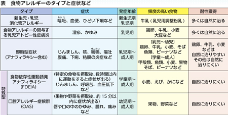 食物アレルギーとひとことで言っても、のようにいくつかのタイプに分かれます。一般的に食物アレルギーと認識されているのは、アレルギーの原因となる食べ物(アレルゲン)を食べて2時間くらいの間に症状が出る「即時型症状」です。