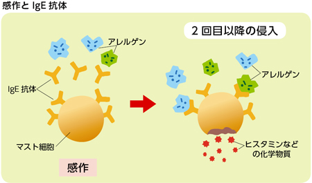IgE抗体は目、鼻、腸、気管支などの粘膜や皮膚にある「マスト細胞」の表面に、アンテナのように張り巡らされます。そのあと再びアレルゲンが侵入してくるとIgE抗体がこれを捕らえ、マスト細胞からヒスタミンなどの化学物質が一気に放出されて、じんましんや炎症などさまざまなアレルギー症状を引き起こします。