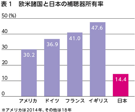 加齢性難聴者が約1000万人いるにもかかわらず、補聴器の販売台数は年間40万台ほど。補聴器を使っている割合は1割台で、欧米諸国よりかなり低くなっています(表1)。ヨーロッパと比べて、購入に対する公的補助のしくみが十分に整っていないことも、補聴器の使用が広がらない一因です。
