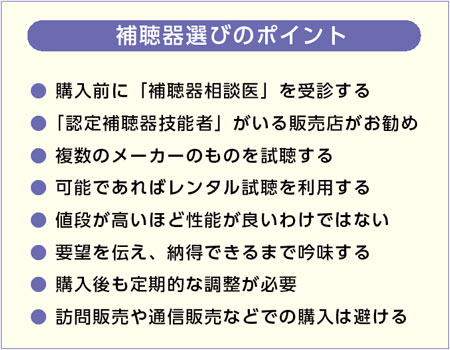 2005年の薬事法改正によって、補聴器は単なる医療用具から「管理医療機器」に規定されました。厚生労働省の認定する管理者がいない限り、補聴器の販売はできません。販売者は少なくとも3年間は売った記録を残して、苦情などに適正に対応しなければなりません。要望をきちんと伝えて、納得できるまで吟味してください。