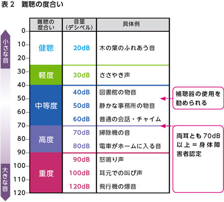 聴こえの状態をチェックするには、「オージオメーター」という機器を使います。受診者が着けたレシーバーに向けて音の高さ(周波数)を変えて音を出力し、それぞれの周波数でどの程度小さい音量まで聴き取れるかを測定します(表2)。さらに言葉を正確に聴き取れているかをチェックするために、「語音明瞭度検査」を行います。
