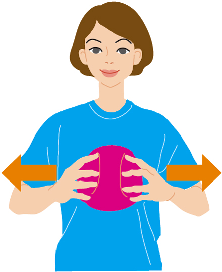 (2)ボールから指が離れないようにしながら、両腕を外側へ引き合う(10秒間を1~2回)。