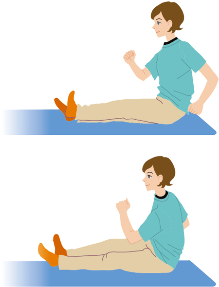 ①床(畳・マット)に腰を下ろし、足と背筋を伸ばす。