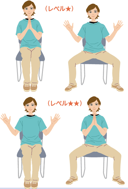 ①いすに浅めに座り、両手を合わせて膝をくっつける。手と膝を同時に離す。その後、手と膝を同時にくっつける(リズミカルに10~20回繰り返す)。(レベル★)