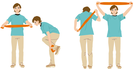 ・ゆっくりと無理のない範囲で行う(下半身のバランスがとりにくい場合は、胸の前→頭の上→背中の往復だけでも可)
