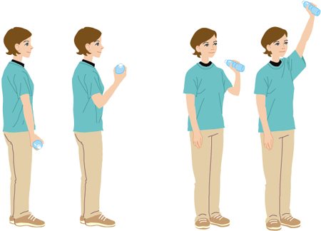 ①右手でペットボトルの胴体を持ち、腕を下ろして肘を伸ばす。