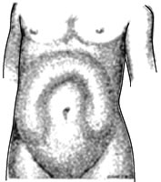 複雑性イレウスの腹痛は急激に始まりどんどん増強します。腹部の膨満は目立たず、腸管全体がまひします。ねじれて締めつけられた部分が硬いこぶのように なり、押すと痛み、触診でわかることがあります。壊死が進むと、おなか全体に腹膜炎が起こり、危険な状態に陥ります。