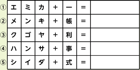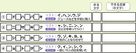 □にリストの中から適切な文字を入れて言葉を作ります。リストの文字のうち、余る文字はどれでしょう?