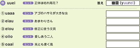 ある言葉をアルファベットにした際の母音(アイウエオ)だけが並んでいます。ヒントを手がかりにもとの言葉を推理してください。