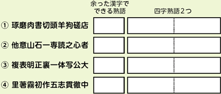 10個の漢字の中から四字熟語を2つ作ると2文字が余ります。