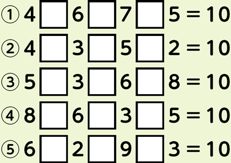 いずれも結果が10になる式です。□には+かーのどちらかが入ります。式を成立させてください。