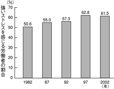 | 図1 仕事や職業生活での強いストレス等の状況 (厚生労働省:労働者健康状況調査より作成) |