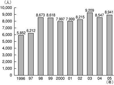 | ※自殺した労働者数は、「管理職」と「被雇用者」の合計 (警察庁生活安全局地域課:平成17年(2005)中における自殺の概要資料2006年より作成) |