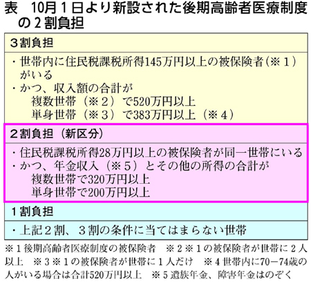 10月1日から75歳以上の高齢者のうち、一定所得以上の人の医療費一部負担割合が1割から2割に引き上げられました。住民税課税所得が年28万円以上で、かつ年金収入やその他の所得(収入から必要経費などを控除した額)の合計が単身世帯で200万円以上、複数世帯で320万円以上の人が対象(表1)。同制度の被保険者の約2割、370万人が影響を受ける大改悪です。(多田重正記者)