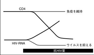 そこでエイズ発症期を迎える前に、抗HIV薬を3剤以上組み合わせた治療を始めます。