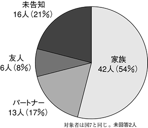 しかし治療法の進歩に比べ、仮に自分が感染者だと思って日本の社会を見回してみたときに、どうでしょう? 感染者を支える環境はあまりできていません ね。まだ「必ず死ぬ」「うつりやすい」という誤解があります。先ほどの60歳以上の患者へのアンケートでは、周囲の誰にも自分が感染者だと打ち明けていな い未告知の人が21%もいます(図9)。自分だけで抱え込んで悩んでいるのです。