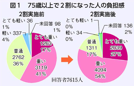 医療費の負担感を聞いた問いへの回答は、高齢者の生活の苦しさを色濃く反映したものでした。2割負担実施前の「とても重い」「重い」あわせて58%が、実施後は81%に激増(図1)。「1回の支払い金額を分割で支払っている」「他(医療費以外)を削るしかないが、方法が見つからない」などの声が。「受診回数を減らすつもり」「リハビリなどを減らそうか考えている」との声がある一方、「金はいのちに変えられない」「受診回数や薬を減らすのは不可能」などの声もあり、医療を受ける権利が脅かされている実態が浮き彫りになりました。
