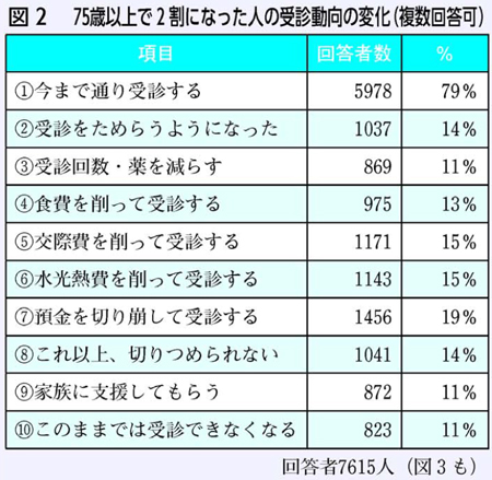 2割化による受診動向の変化について聞いた質問(複数回答可)では、「今まで通り受診する」は79%にとどまり、「受診をためらうようになった」が14%、「受診回数・薬を減らす」が11%(図2)。食費、交際費、水光熱費などを削ったり、貯金を切り崩すなどの回答のほか、「これ以上、切りつめられない」が14%、「このままでは受診できなくなる」との回答も11%ありました。「今まで通り受診する」と答えた人も、39%が同時に(2)~(10)を選択し、生活費や医療費を切りつめたり心配しながらの受診であることがわかりました。