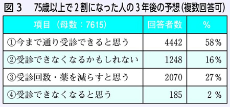 さらに深刻なのが3年後。2割化にあたり、国は患者負担増を3000円以下に抑制する「配慮措置」をとっていますが、2025年9月末までの時限措置です。3年後を予想して受診できると思うかどうか聞いた問い(複数回答可)では、「今まで通り受診できると思う」と答えた人は58%にすぎず、「受診できなくなるかもしれない」が16%、「受診回数・薬を減らすと思う」が27%。「受診できなくなると思う」という回答も2%ありました(図3)。