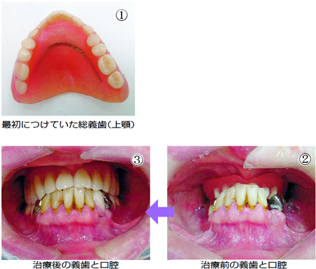 義歯完成後は、写真③のようになりました。揚げせんべいを食べてみると、「いい音!」と感嘆の声が。バリバリと咀嚼できました。「これならいろいろ食べられる。健康になれる」と前向きな言葉も出るようになりました。