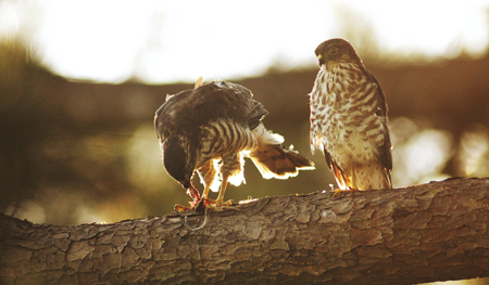 草原には小さなネズミやバッタ、小鳥までさまざまな生きものがおり、親鳥は捕えてきては若鳥に与えていた。ある調査では、繁殖期にペアが必要とする小鳥の数は350羽と推定されている。猛禽類は意外と街にも適応しており、全国の観察例ではビル街での営巣も確認されている。ハトやヒヨドリなどが都市部にもたくさんいるためだ。