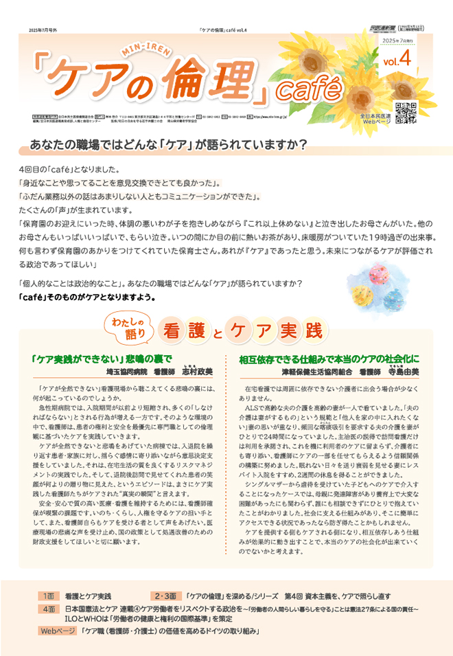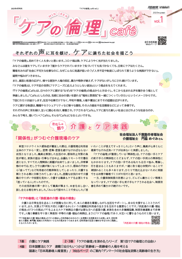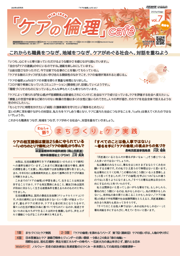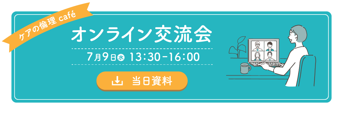 ケアに関する物語は、職種やセクシュアリティなど様々な属性、その人の歴史や生活環境などによって多様です。それぞれの声に耳を傾け、互いに関心を向け、尊重され、ケアされる「Café」。ケアに満ちた新しい社会とはどのような社会なのか、みんなで考え、描いていく「Café」。そんな「Café」になるとよいですね。
