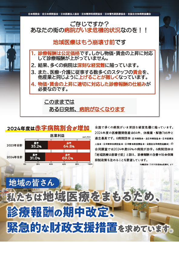 学習・宣伝、署名用紙など チラシ・パンフレット 動画 署名用紙 チラシ・パンフレット 地域医療チラシ(A4・両面刷)(PDF1.58MB) 地域医療ポスター(縦型・A2サイズ)(PDF4.87MB) ①民医連・選挙要求チラシ『2025年参議院選挙にあたって、民医連は訴えます』(A4・両面刷)(PDF695KB) ②職員向け学習リーフレット『絶対に変えられる!』(B5・6P・巻き三つ折)(PDF1,144KB) ③宣伝用ともうさプラスター 7種類(縦型・A1サイズ)(PDF686KB) ③宣伝用ともうさプラスター 『VOTE投票へ!』(横型・A3サイズ)(PDF926KB) ④医療法学習リーフレット『あなたのまちは大丈夫? 全国にひろがる医療・介護の空白地域』(PDF1,441KB) 民医連・選挙要求チラシ『2024 年衆議院選挙にあたって、民医連は訴えます』(A4・両面刷)(PDF658KB) 職員向け学習リーフレット『選ぼう!いのちまもる社会』(A5 8 ページ・観音折)(PDF1,299KB) 宣伝用ともうさプラスター 5 種類(A1 サイズ)(PDF569KB) 「今までどおり保険証でも受診できます」チラシ(A5)(PDF1,542KB) 「今までどおり保険証でも受診できます」ポスター(A3)(PDF687KB) 1 2 3 4 5 記事関連ワード