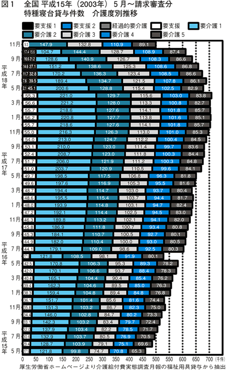 財政削減を基調とする社会保障費抑制策により、2006年度介護報酬改定において貸しはがしが行われました。その内容は、表1にある通りです。 この改正では、介護ショップを含めた福祉用具貸与業界の弱点が突かれた格好となりました。それは、一部の行政やケアマネジャーからの「利用者宅にてベッド・車いすが埃をかぶっている」「利用をしない福祉用具の貸与は財源の無駄遣い」等の声にも表れています。私の訪問した利用者宅でも、ごく一部に福祉用具(特にベッド)が充分に使いきれていない例がありました。まず、こうした業界への苦言に対して、真摯に襟を正す必要があります。 一方、最も見逃してはならないのは、多くの利用者及び家族から「貸しはがし」に対して連日自治体(介護保険の保険者)窓口へ猛抗議が続いたことです。私もベッドを利用する要支援1・2、要介護度1の利用者を訪問した際に、ベッドの上下動や背上げ機能を使って起立・歩行を行い、さらにはトイレや浴室へ歩行する利用者を多く見ています。 図1は特種寝台の貸与件数推移を要介護度別に示したものです。最もベッド総件数が多かった 200 年4月審査(実質3月分)では70.8万台の内、要介護1- 22.1 万台、要支援- 5.5万台、計 27.6万台でした。それが2006年 11 月審査分(実質10月分)では49.5万台の内、要介護1- 0.9万台、要支援1- 0.1 万台、要支援2- 0.3万台、経過的要介護- 0.6万台、計1.4万台となりました。26.2万人分のベッドが「貸しはがし」をされました。自治体窓口に連日猛抗議が続いたのは、当然のことです。 次に図2は、各要介護度別のケアプラン件数に占めるベッド件数の比率を示してあります。改定以前には要支援は約1割、要介護1は2割程度です。確かに要介護1は、図1で見たようにベッド件数は最も多かったが、ケアプラン数の約2割の使用です。「介護度が実態より軽く出る」といった声に象徴された介護度認定制度の不備を考えると、1割、2割のベッド使用を多くの国民(介護保険料を納める)が不必要と判断するとは考えられません。また、要支援1、2、要介護1の11月審査分(実質 10 月分)ベッド件数は、3月分の5%程度でした(月遅れも含まれる)。この結果から、表1にある例外規定が、ほとんど運用されていないと考えられます。 こうして貸しはがされる利用者に対して、多くのケアマネジャーや地域包括支援センターは、安全性や衛生面、廃棄による環境問題等があることも知りつつ、中古ベッドの廉価販売・貸与を積極的にすすめたのです。 以上見てきたように、「貸しはがし」は寝たきりとならないように予防するとした介護保険の趣旨とは逆行する、理不尽な施策といえます。 この間の「貸しはがし」による混乱を振り返ると、介護認定制度の不備には触れずに、先に述べた一部利用者の話が誇張・拡大され、あたかも全体の話であるかのようにして「貸しはがし」が断行されました。まさに、社会保障費抑制策をすすめる政府・行政にうまく「貸しはがし」されたという印象があります。