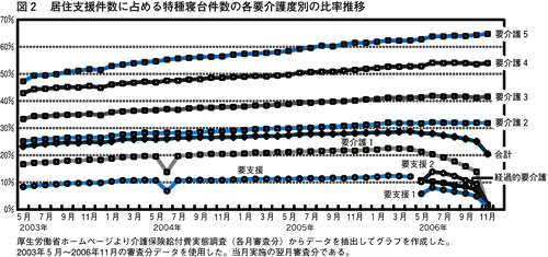 厚生労働省の 2006 年度改正資料「要支援1・2の標準利用例(案)」を見ると、福祉用具貸与の項には、例として「補助杖」があげられています。杖の月あたり貸与価格は 1000 円程度です。一方で、貸与事業者は定期的なメンテナンスを行わなければなりません。メンテナンスに関する人件費や経費支出を考えると、要支援1・2の利用者の比率が高くなると、収益に対するメンテナンスコスト比率は増加します。よって、多くの介護ショップは、事業の主たる対象を要介護度1〜5の利用者へ絞ると予想していました。実態もその通りとなっています(図3 5月からの介護費推移を参照)。 以上から、民間事業所が安上がりな予防介護を担うのは、事業の継続性という点から無理があります。そのために、介護予防は自治体が直接責任を持って行うほうがよいのではないでしょうか。