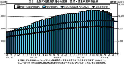 図3は福祉用具貸与事業者の登録数と介護保険請求事業所数、そして月別給付費推移を示したものです注)。 2006年10月分の収益が前年度同月対比で- 19.1 %となりました。請求事業所数の増減はほとんどなく、各介護ショップの収益は概ね2割の減少となります。この約2割の減収が介護ショップに危機を招いています。そこで、質の向上と共に収益増加という課題に取り組まなければなりません。